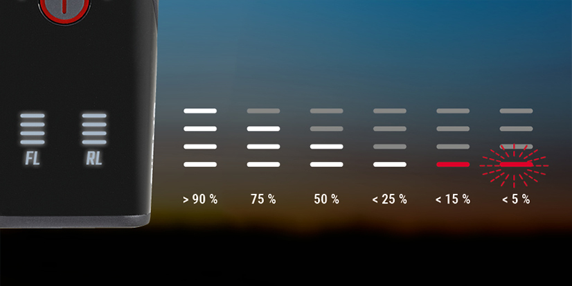 П'ятирівневі LED індикатори демонструють стан розряду батареї, як переднього так і заднього ліхтаря. Також, вони інформують про стан заряджання.